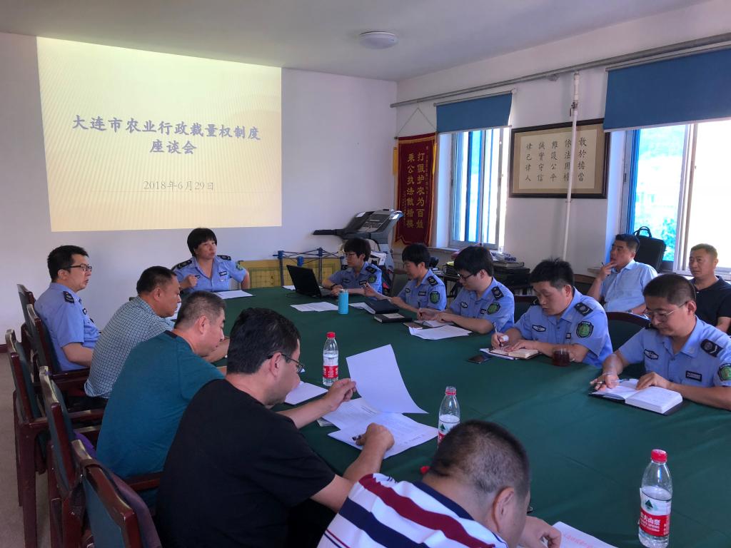 根据《大连市农委制定完善行政裁量权制度工作方案》的要求,6月29日,市农业行政执法支队召开了行政裁量权制度专家座谈会。市支队刘桂芬支队长、朱海明副支队长、各专业大队大队长以及来自9个区市县执法大队及相关职能单位的负责人、执法骨干共计27人参加了此次座谈会。