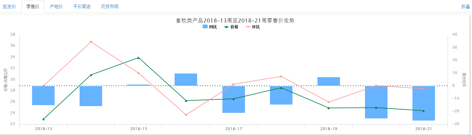 2018-21周,大连市畜牧零售价周均价为24.41元每公斤,较上年同期33.49元每公斤,同比大幅下跌27.1%;较上期24.97元每公斤,环比下跌2.26%。其中最高价为33.91元每公斤,最低价为22.93元每公斤。