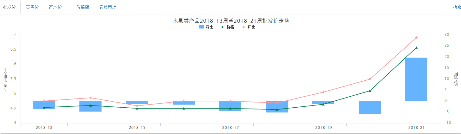2018-21周,大连市水果产地价周均价为6.36元每公斤,较上年同期6.07元每公斤,同比上涨4.83%。较上期7.74元每公斤,环比下跌17.79%。其中最高价为28.21元每公斤,最低价为6.36元每公斤。