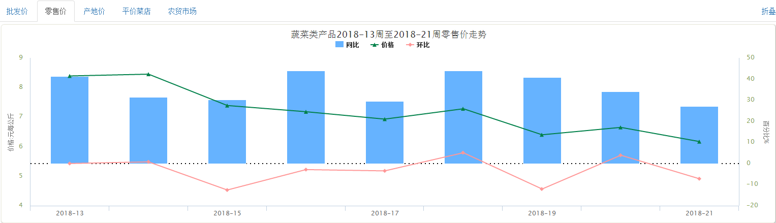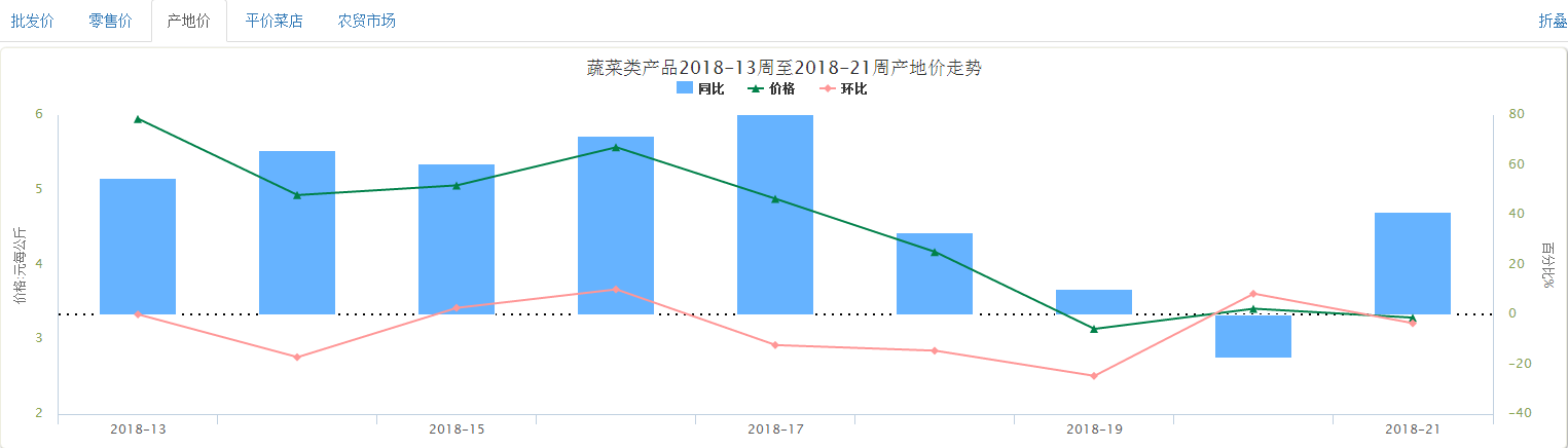 蔬菜:本周监测的29种(3升3降23平),平均批发价为3.5元,环比上涨2.37%。其中下降较明显的有茄子_青、青椒、生菜,价格为2.6、3.52、1.89元,环比下降13.33、13.51、17.19%;上涨较为明显的有大葱、茼蒿、香菜,价格为2.29、4、6.32元,环比上涨23.19、57.75、26.43%,其余品种没有大幅升降。本周监测的14种(1升3降10平),平均零售价为6.15元,环比下降5.86%。其中下降较明显的有尖椒、芹菜、蒜薹,价格为5.7、5.54、8.57元,环比下降22.25、7.82、13.26%;上涨较为明显的有西红柿,价格为7.12元,环比上涨7.48%,其余品种没有大幅升降。本周监测的22种(3升3降16平),平均产地价为3.44元,环比下降3.05%。其中下降较明显的有苦苣、生菜、油麦菜,价格为1.1、1.33、1.27元,环比下降63.33、46.67、57.78%;上涨较为明显的有茼蒿、香菜、小白菜,价格为3、5、2.8元,环比上涨100、150、61.54%,其余品种没有大幅升降。