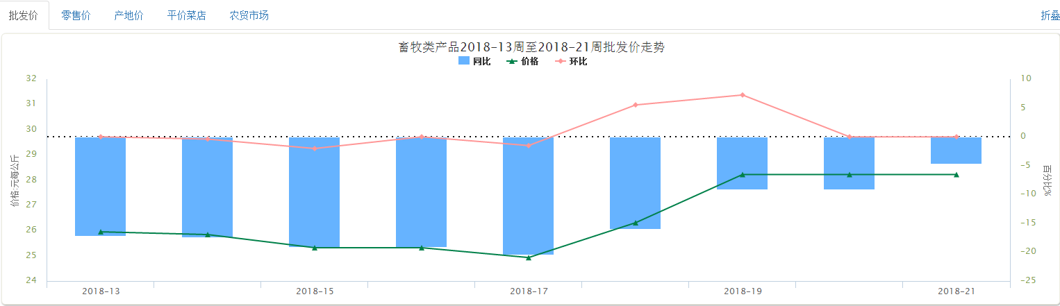 2018-21周,大连市畜牧批发价周均价为28.22元每公斤,较上年同期29.61元每公斤,同比大幅下跌4.71%;较上期28.22元每公斤,环比基本持平。其中最高价为28.22元每公斤,最低价为24.93元每公斤。