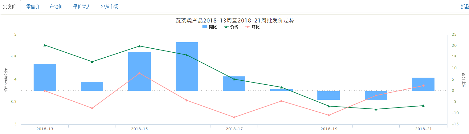 2018-21周,大连市蔬菜批发价周均价为3.42元每公斤,较上年同期3.23元每公斤,同比上涨5.97%。较上期3.34元每公斤,环比上涨2.32%。其中最高价为4.77元每公斤,最低价为3.34元每公斤。