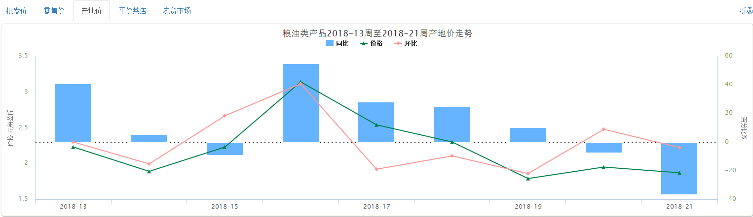 大连市粮油类产品2018-13周至2018-21周产地价行情:2018-21周,大连市粮油产地价周均价为1.87元每公斤,较上年同期2.95元每公斤,同比大幅下跌36.56%;较上期1.95元每公斤,环比下跌3.89%。其中最高价为3.14元每公斤,最低价为1.79元每公斤。
